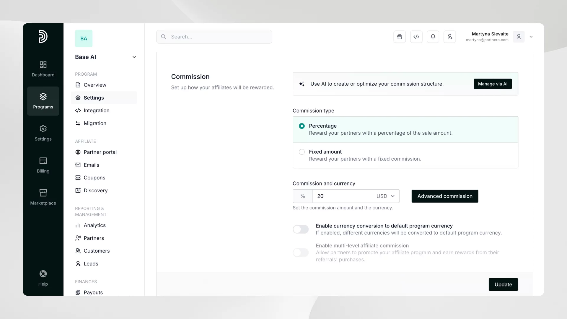 Once you've defined your commission strategy, it's time to bring it to life in your affiliate program. Partnero makes this easy with its Advanced Commissions feature, allowing you to tailor commission logic to match your business goals.