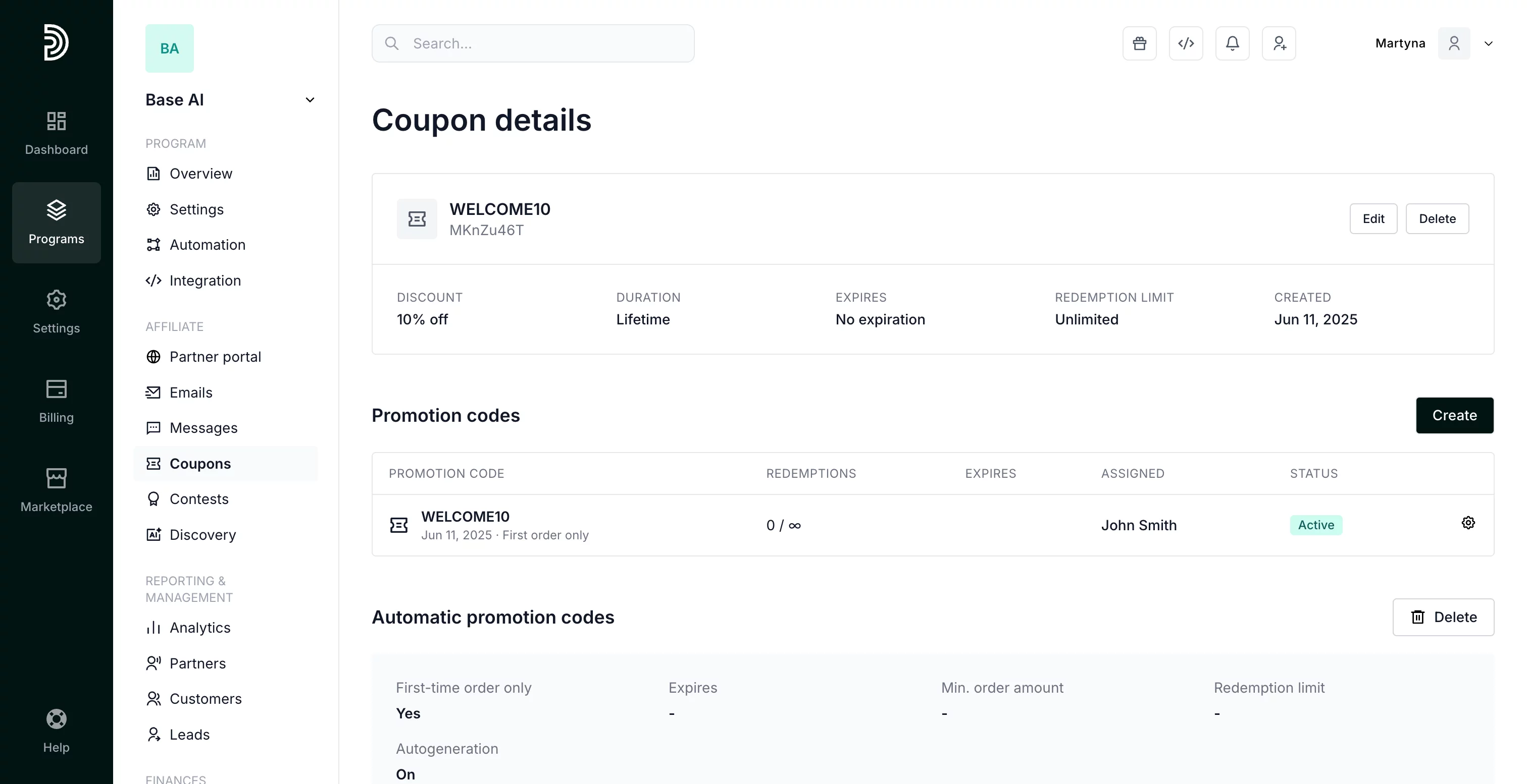 Manual assignment: Create specific codes and assign them to individual affiliates. Great for VIP partners or custom campaigns.