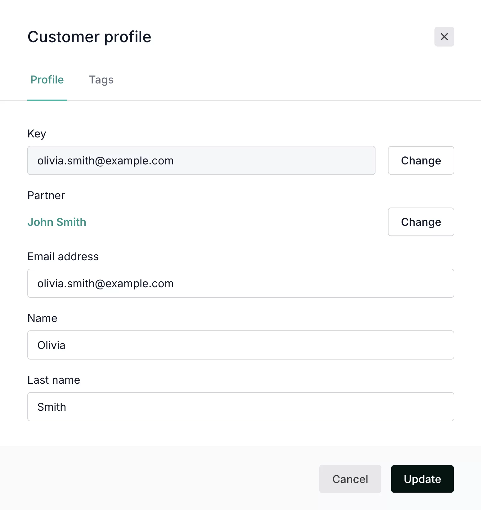 Update names, emails, or customer keys anytime. Reassign a customer to a different partner if circumstances change.