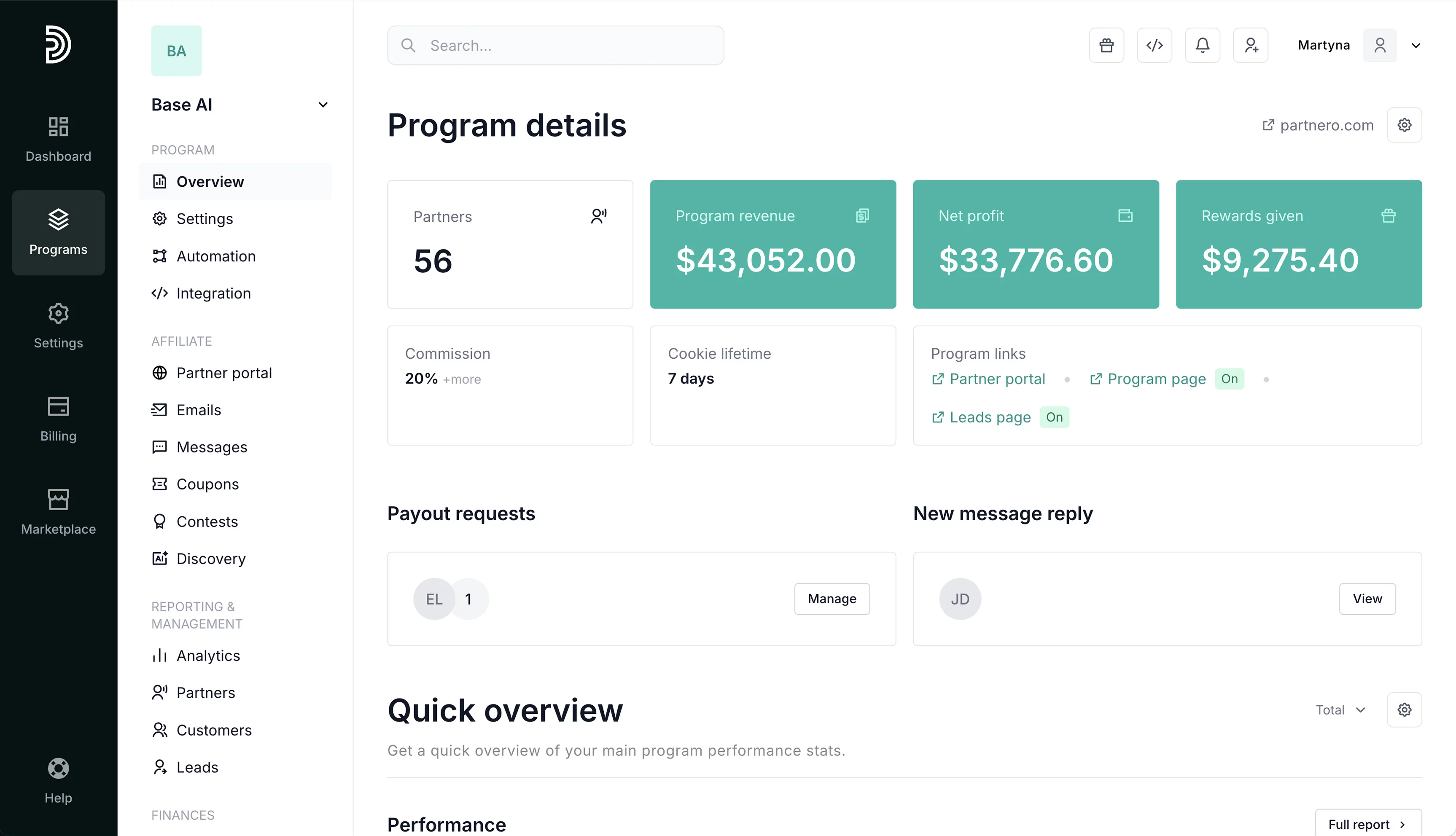 Track key metrics like conversion rate, revenue per partner, lead quality, and performance trends.