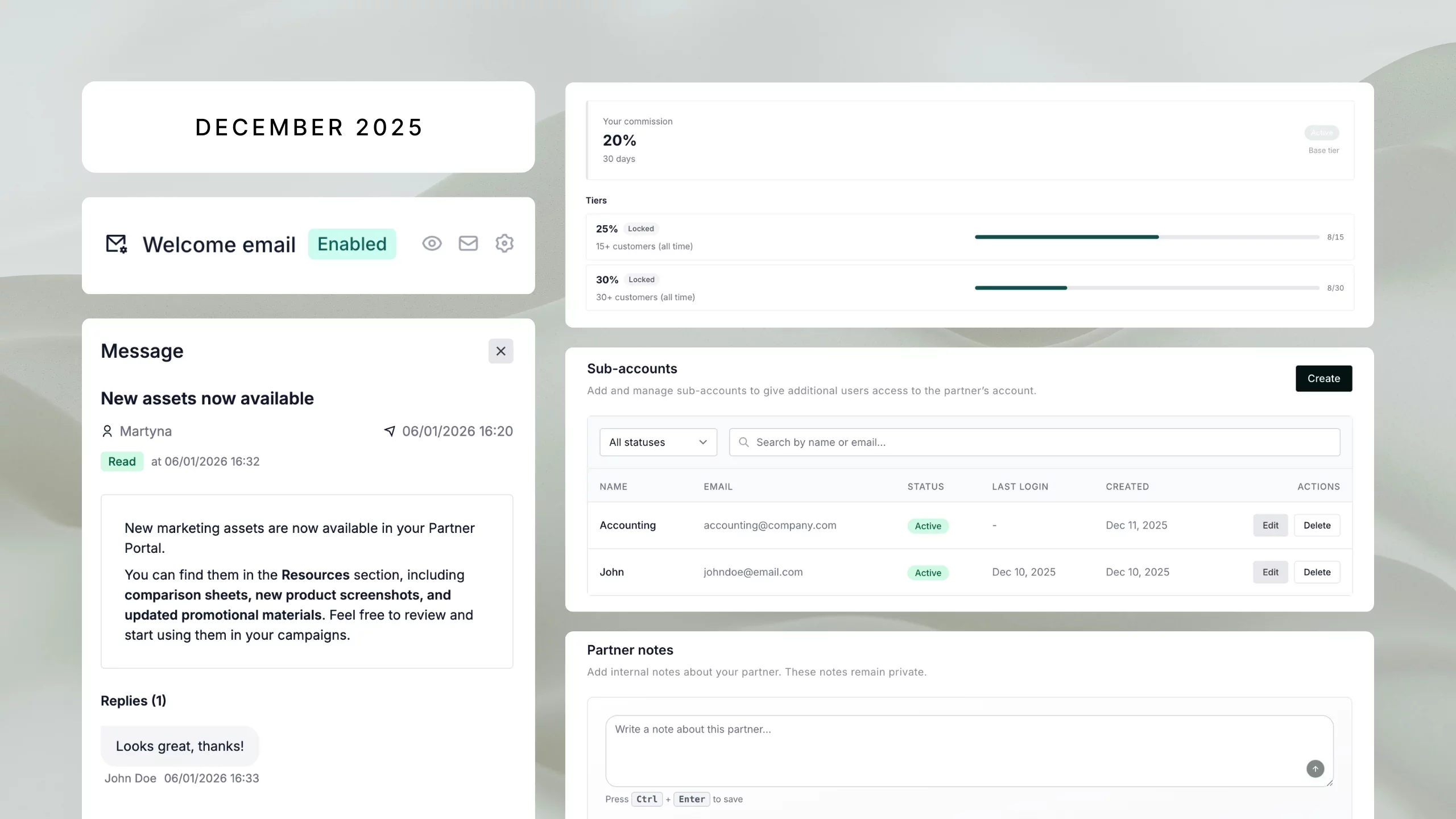 Communicate directly with your partners through a new in-app messaging system. Send announcements, share updates, or respond to partner inquiries without leaving Partnero. The messaging feature includes recipient management and threaded replies for organized conversations. Read more.